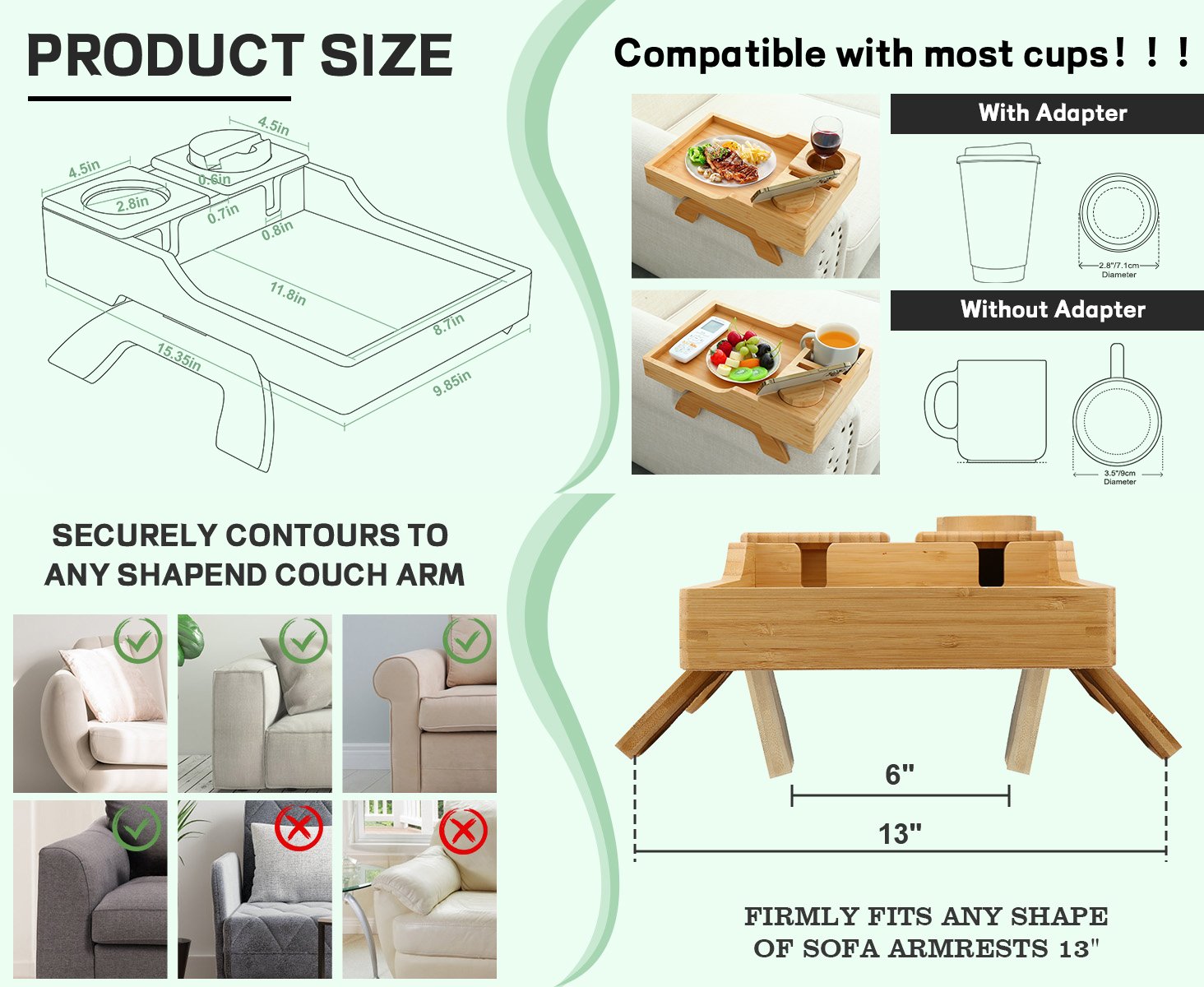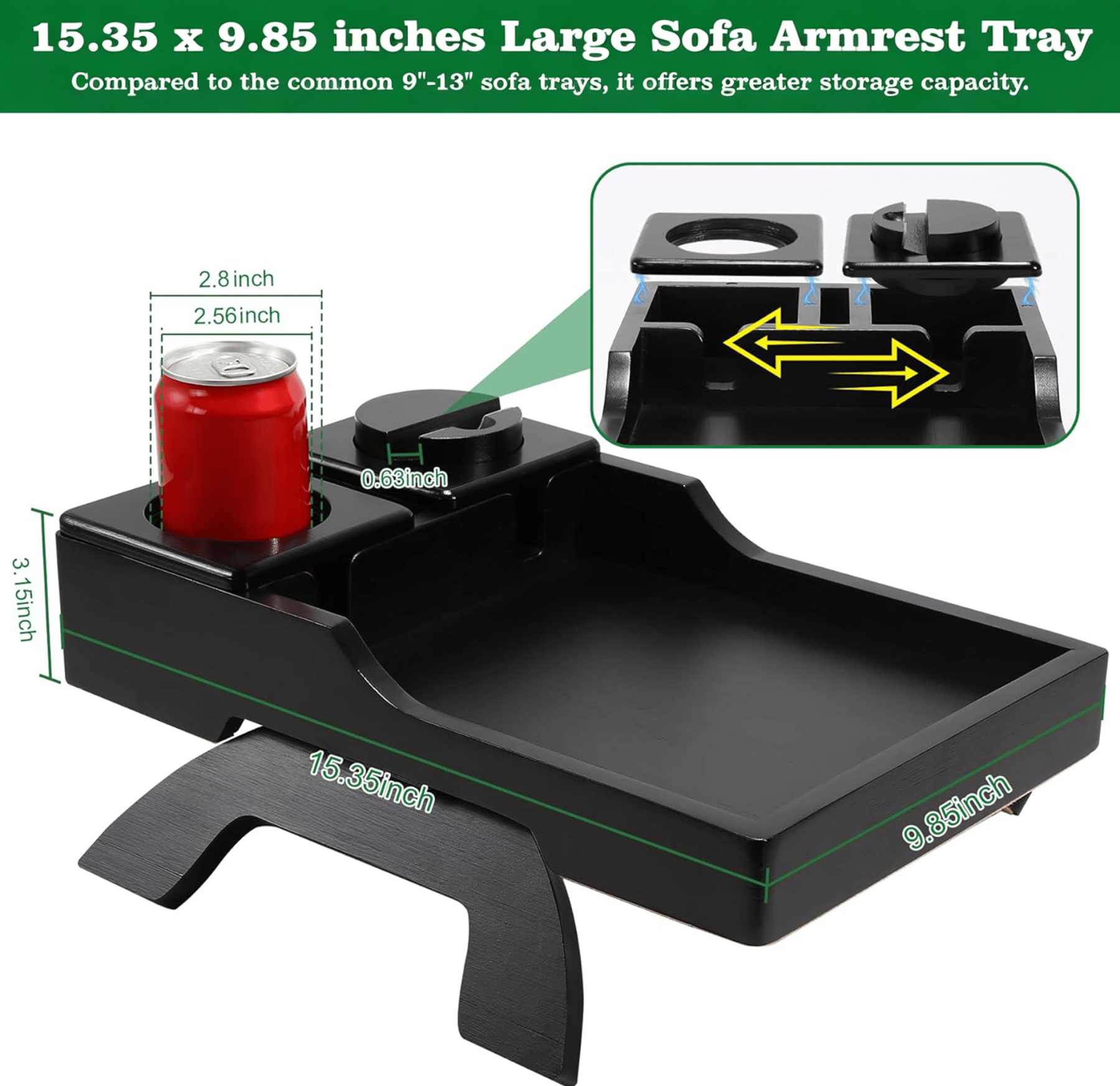 A: It fits most sofa armrests up to 13 inches wide thanks to its adjustable design.