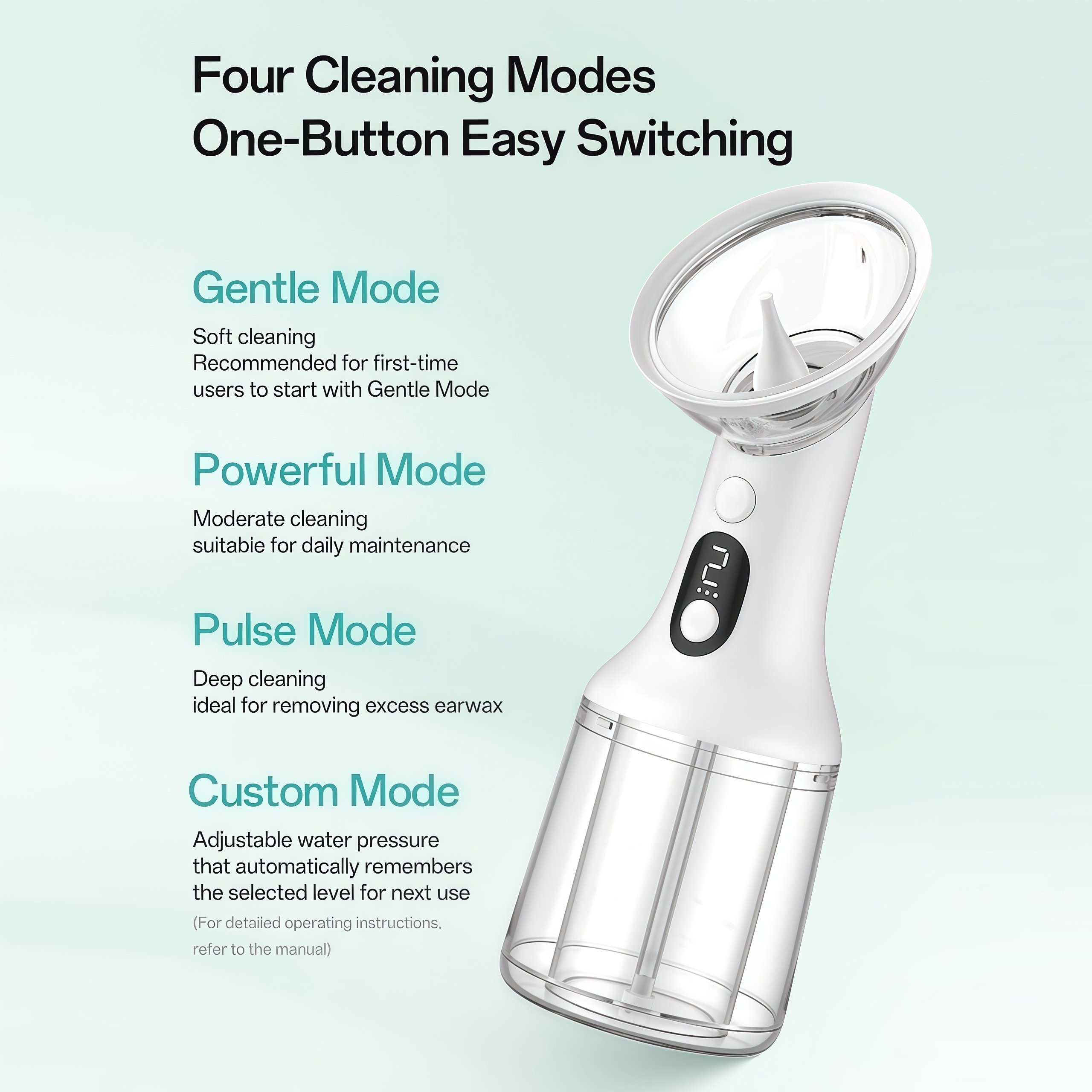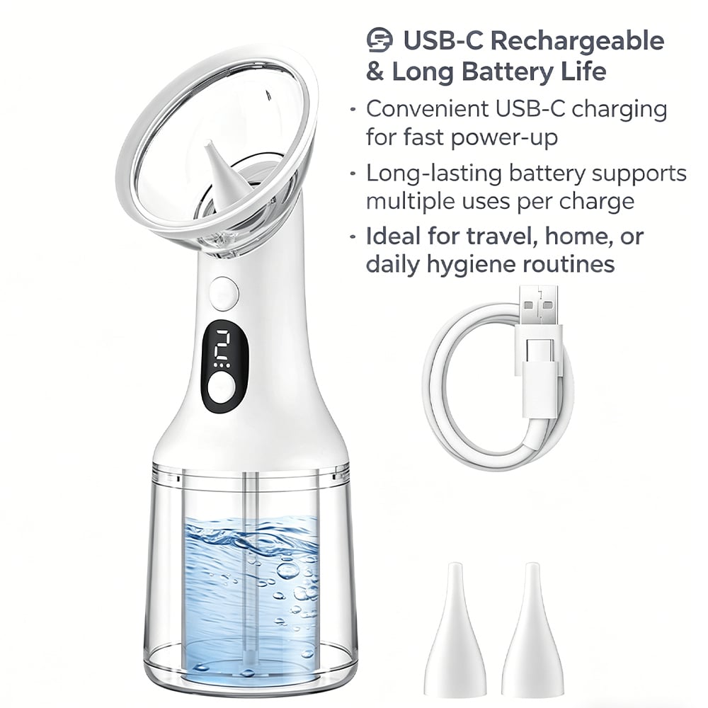 This upgraded ear-cleaning device is designed for comfortable home use, combining efficiency, safety, and convenience. Its dual-tank system keeps clean and wastewater separate, eliminating mess, while USB charging and long battery life ensure hassle-free use. With four adjustable modes and dual nozzles, it easily adapts to both gentle and deep cleaning needs. The IPX7 waterproof design also allows safe use in the shower, delivering a more effective and comfortable ear-care experience.