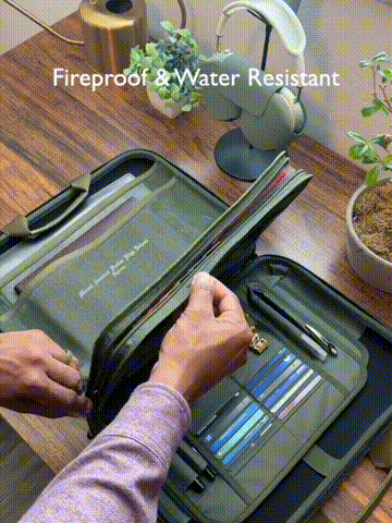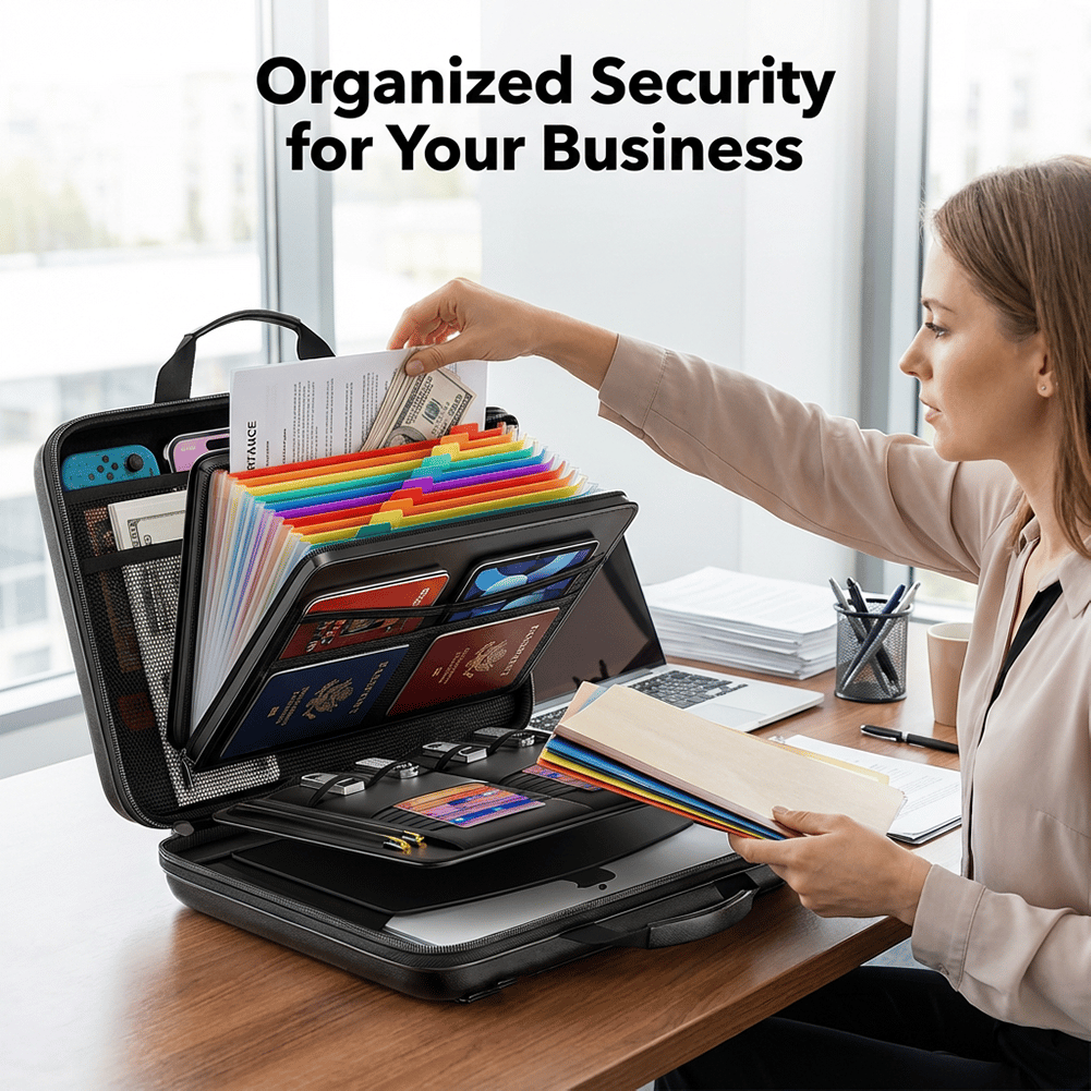 Built with reinforced fire-resistant materials, a secure combination lock, and a spacious accordion-style interior, it keeps your valuables safe, organized, and easily accessible when you need them most.