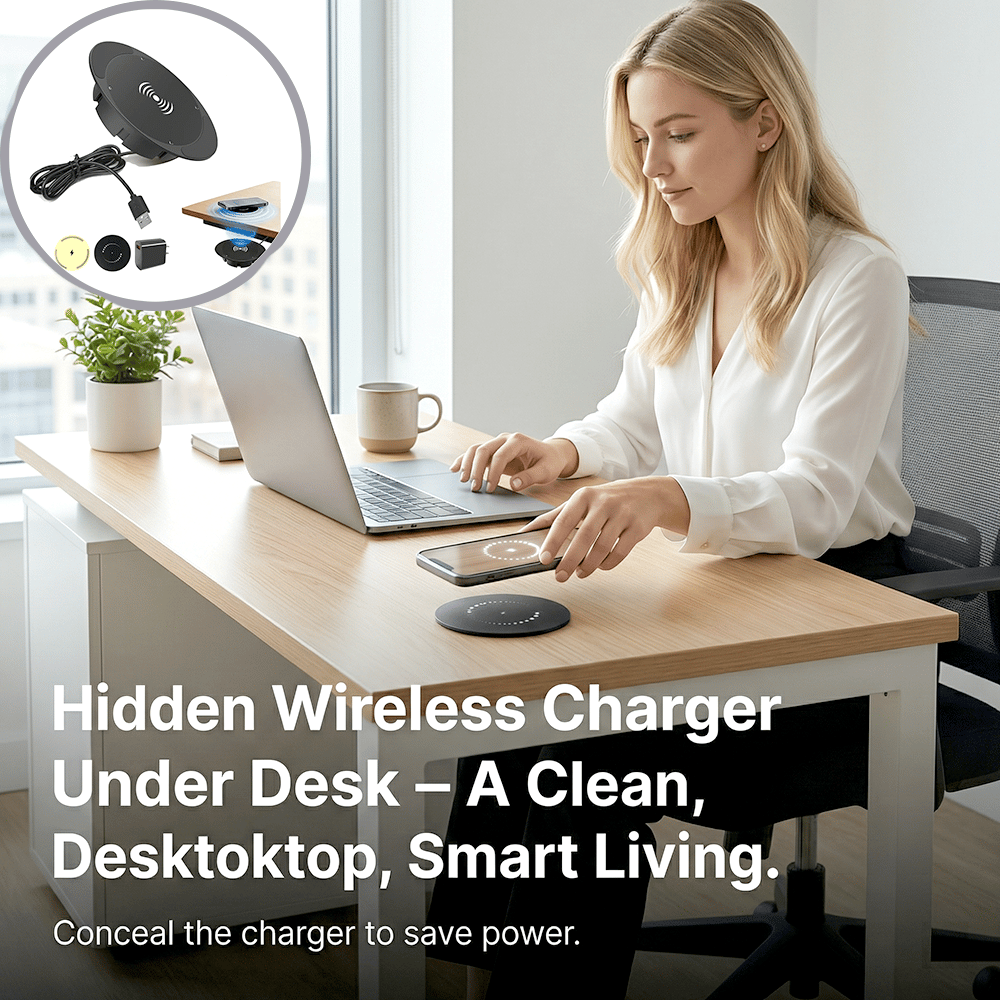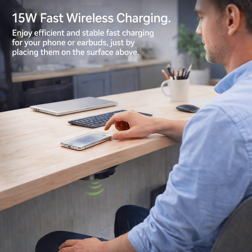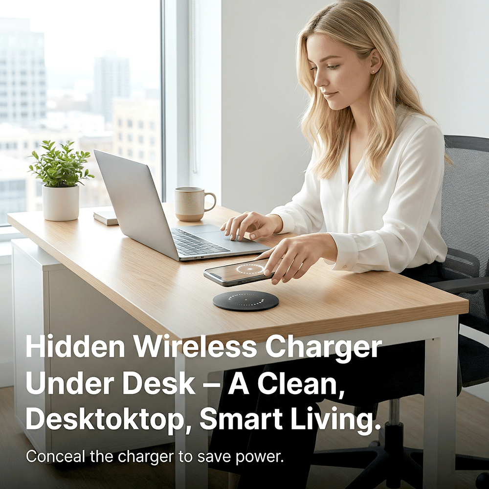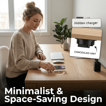 Upgrade your space with a sleek, invisible charging solution. This under-desk wireless charger keeps your devices powered without cluttering your surface—no cables, no mess, just effortless convenience.