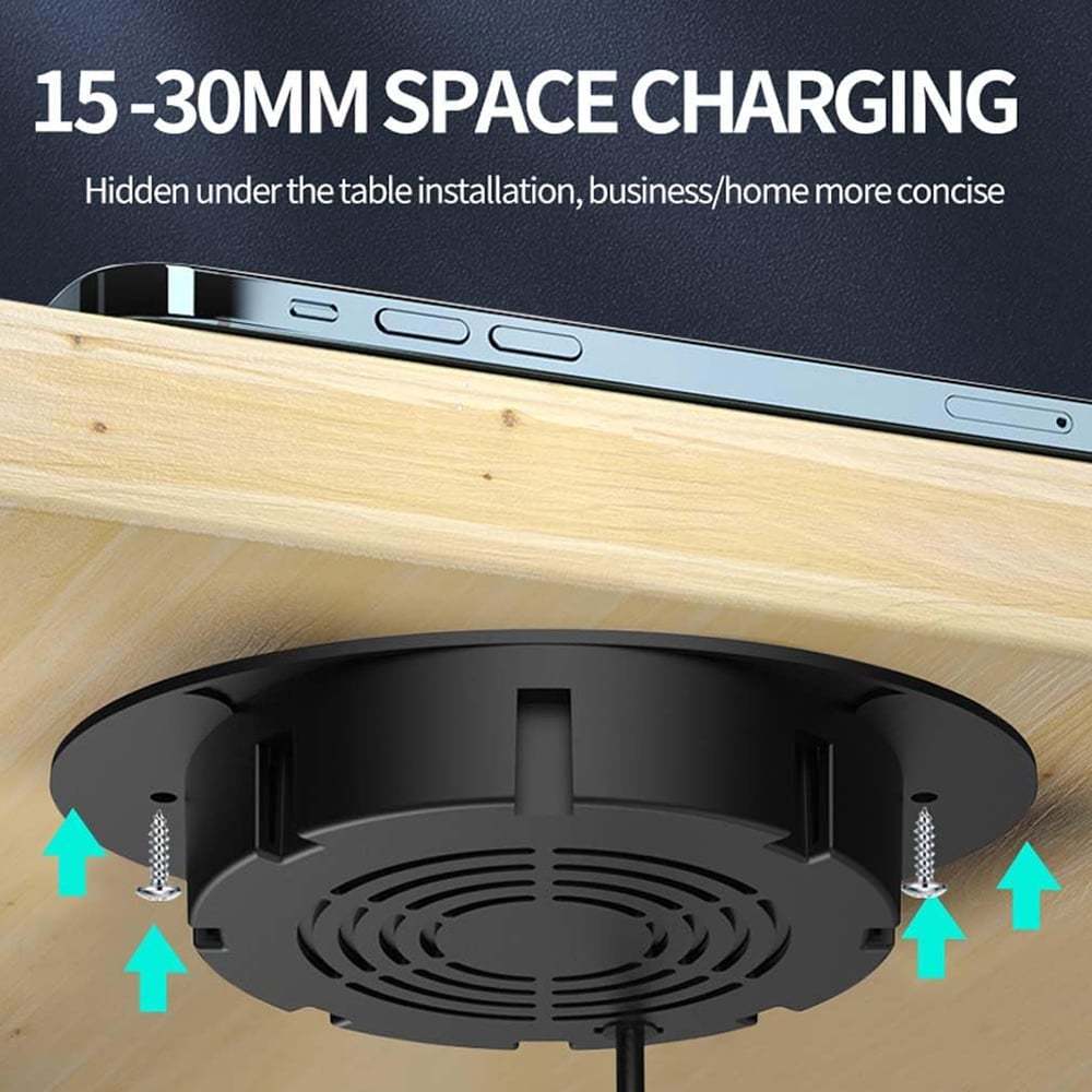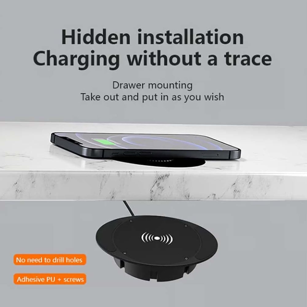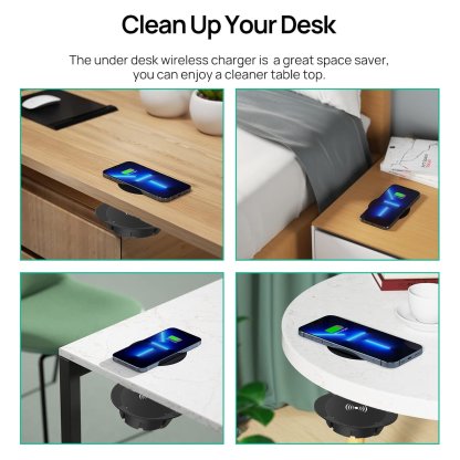 This charger can be installed under your desk without drilling, cutting, or causing permanent damage, completely concealing itself while providing seamless wireless charging—keeping your workspace tidy and elegant, and your furniture intact.