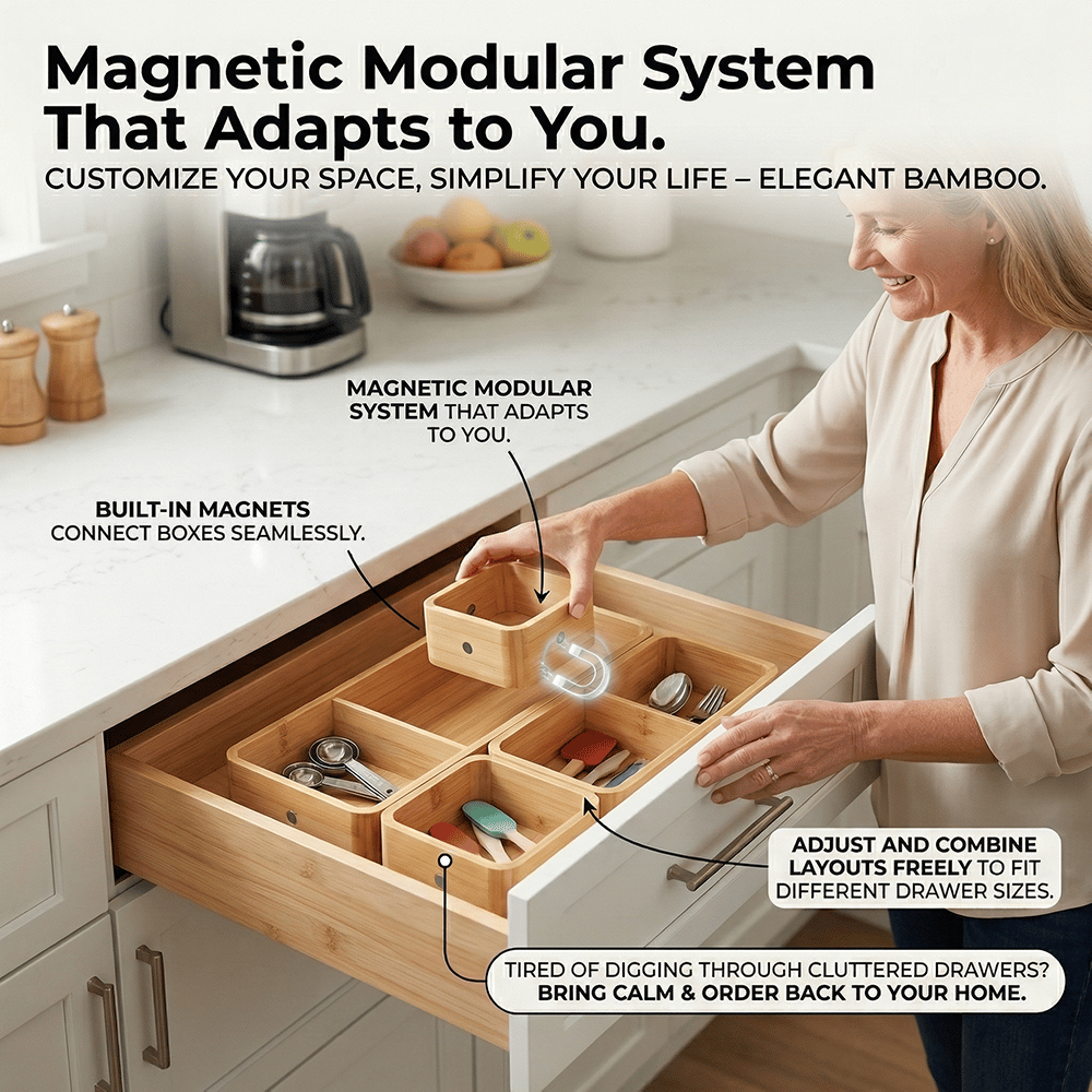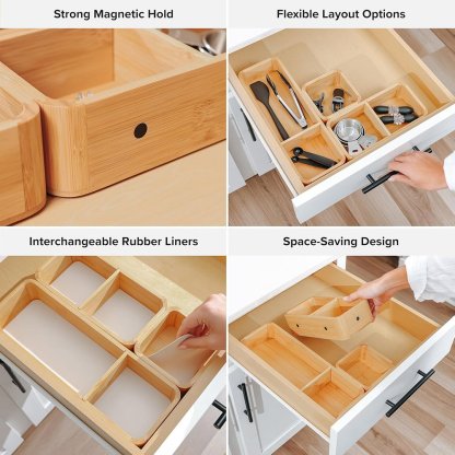 Each box connects seamlessly with built-in magnets, allowing you to freely adjust and combine layouts to fit different drawer sizes and storage needs.