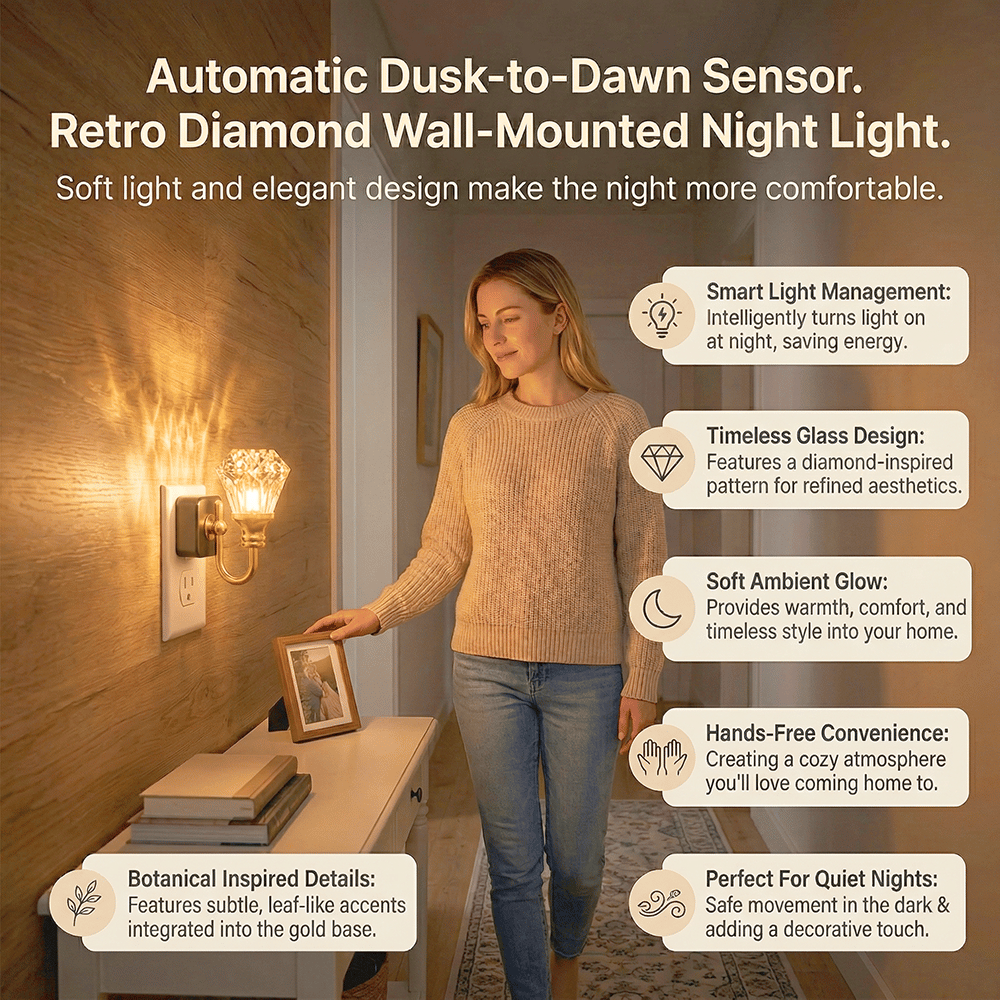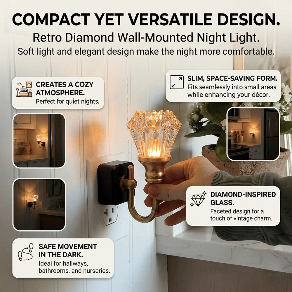 Bring warmth, comfort, and timeless style into your home with this beautifully designed retro wall-mounted night light. Featuring a diamond-inspired glass design and soft ambient glow, it does more than illuminate—it creates a cozy atmosphere you’ll love coming home to.