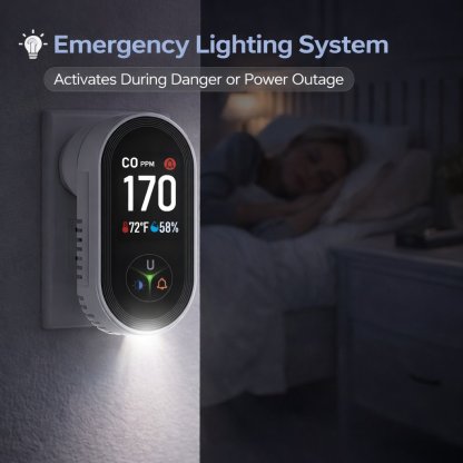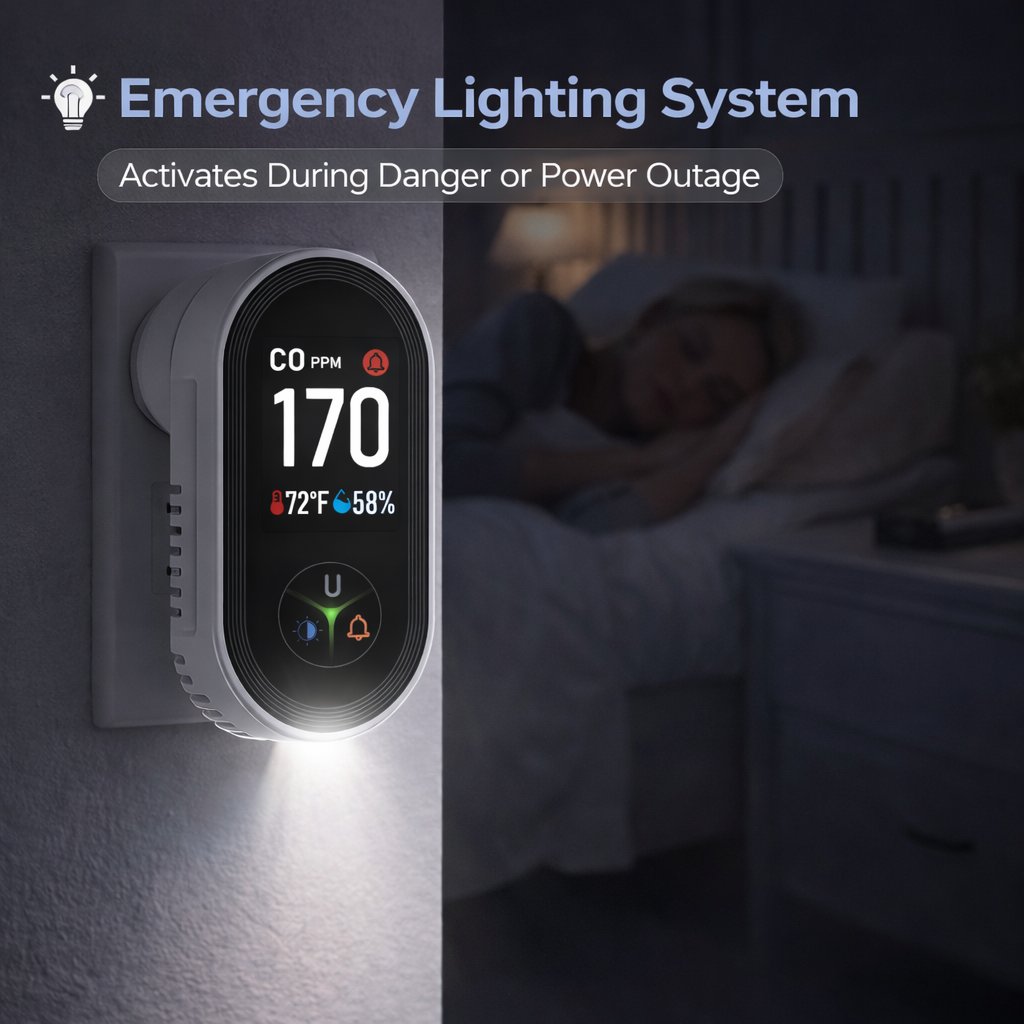Activates emergency lighting during dangerous CO levels and power failures, while maintaining audible alerts.
