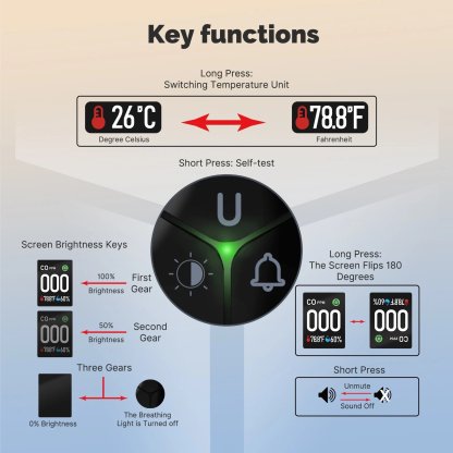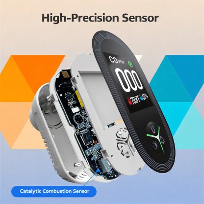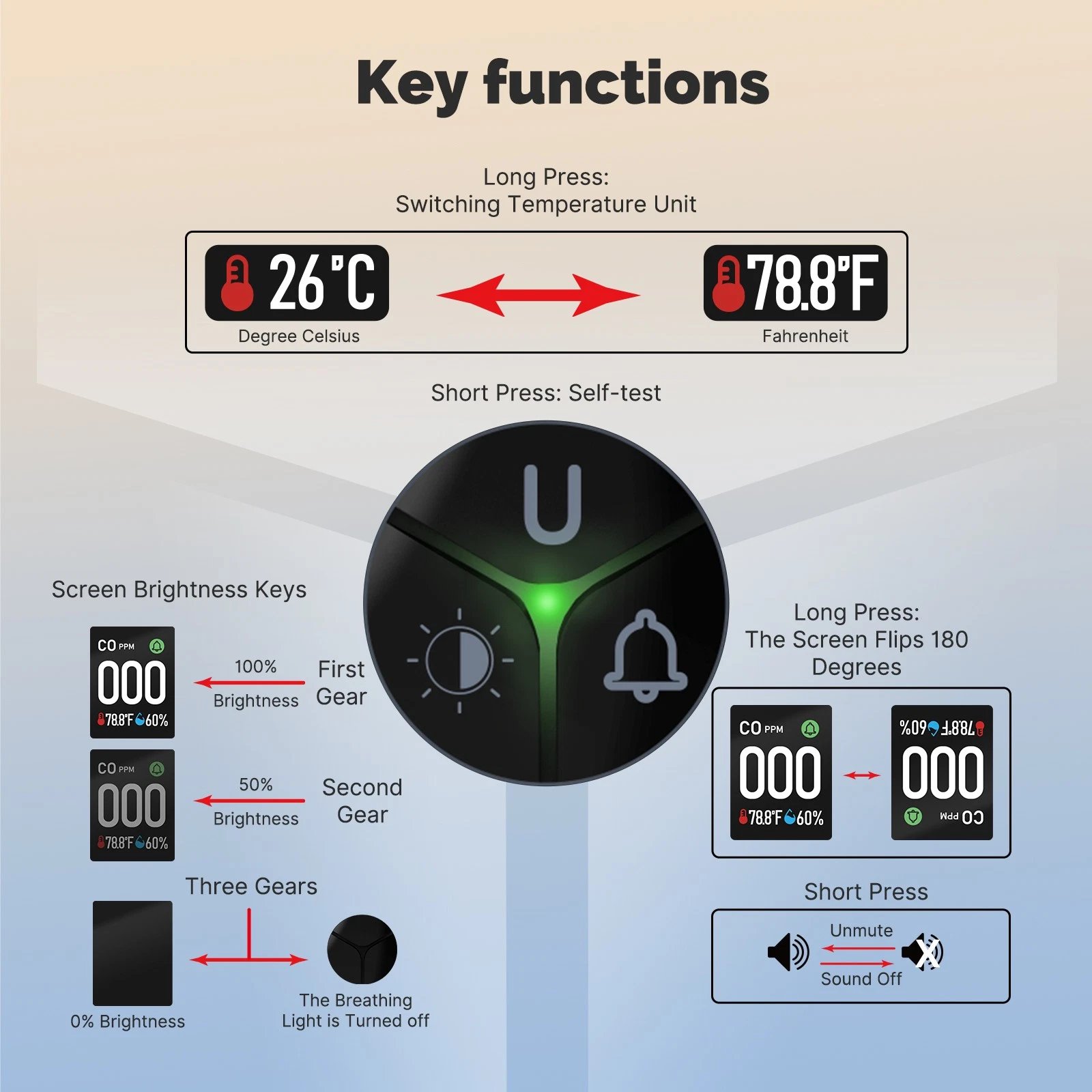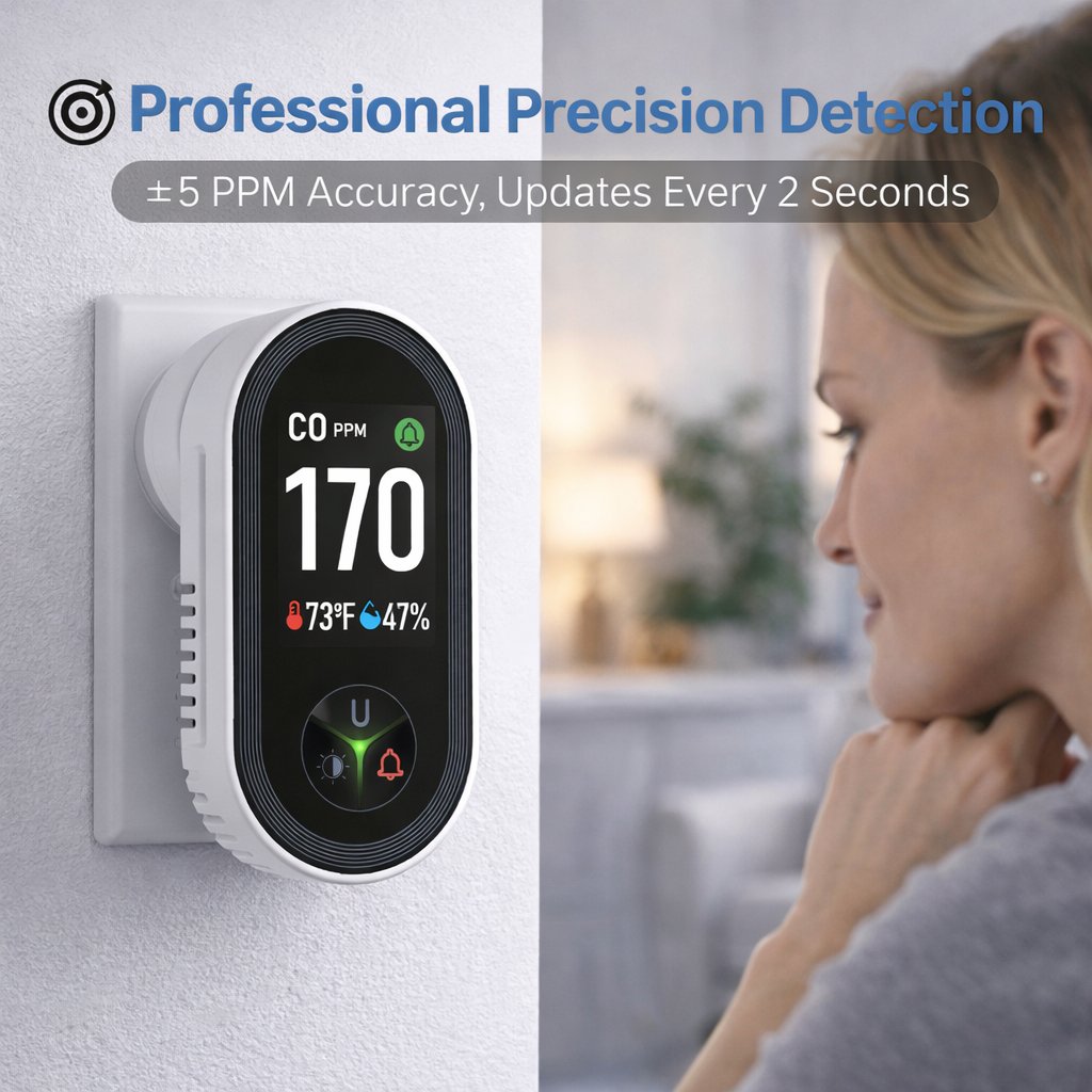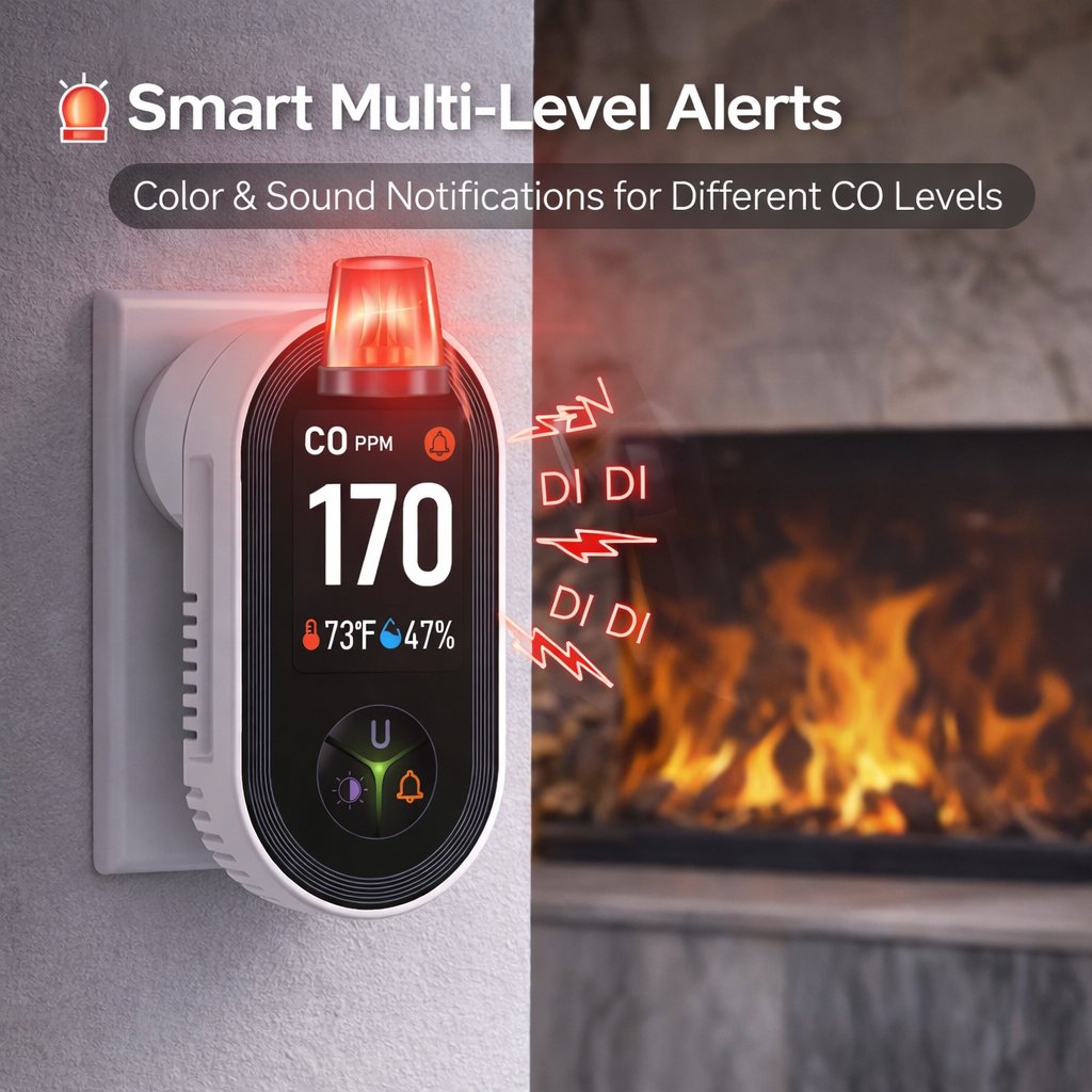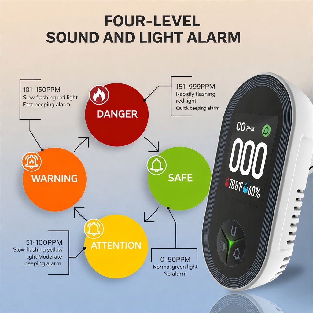 Color-coded visual alerts combined with distinct sound alarms for different CO levels to keep you informed at a glance.
