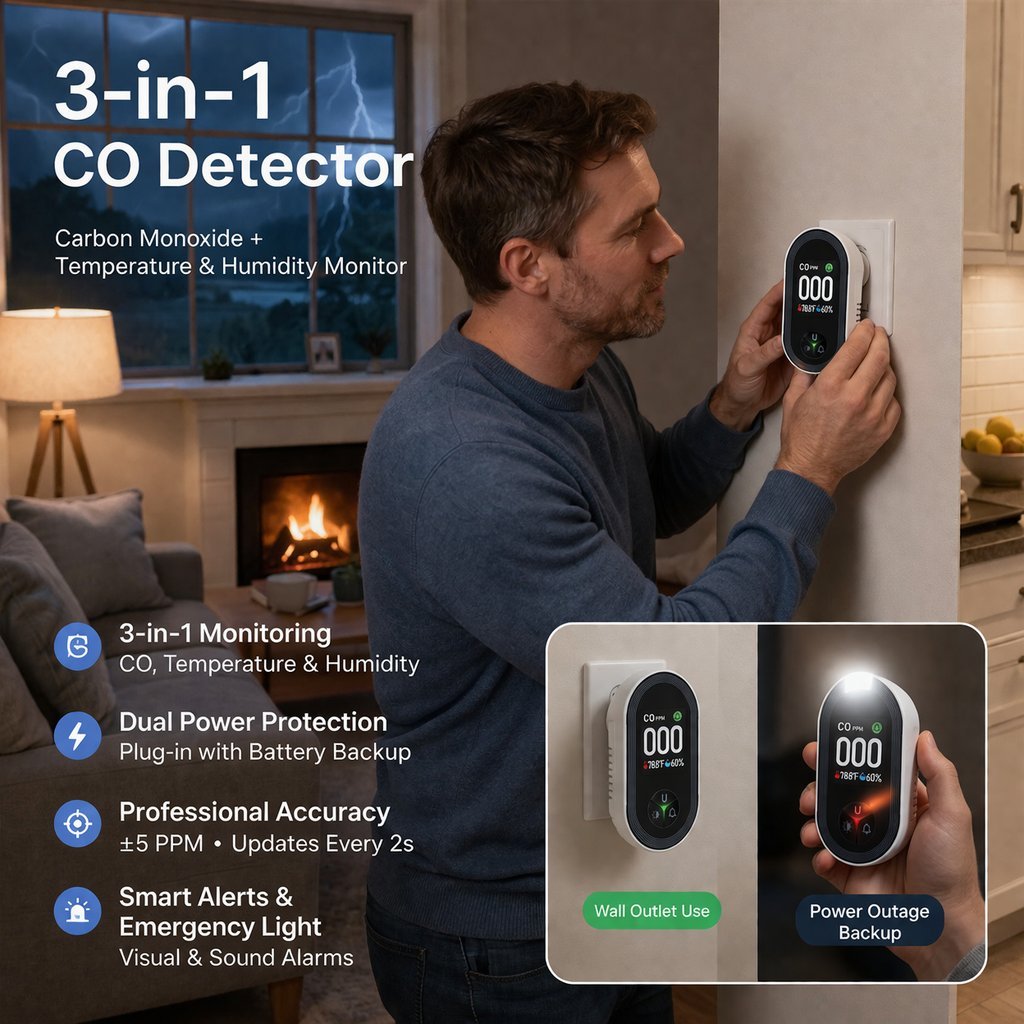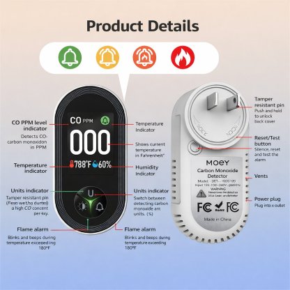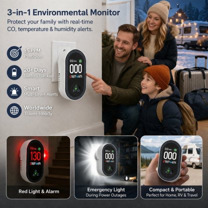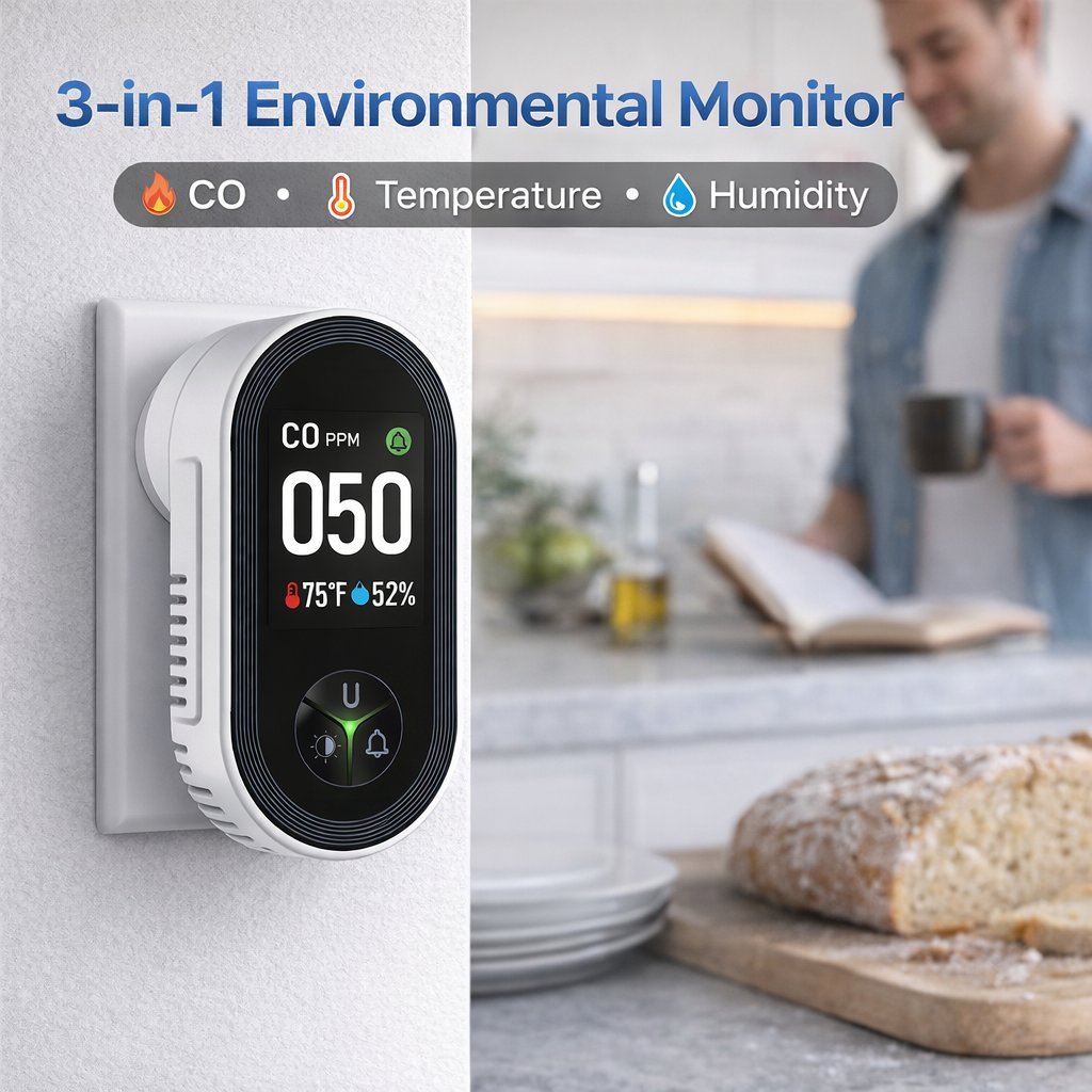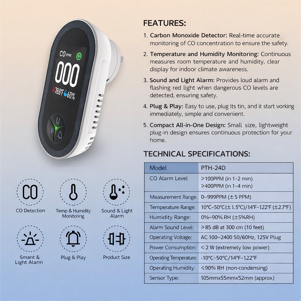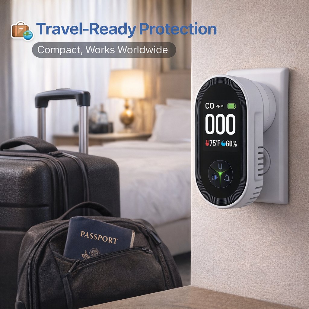 Compact, reliable, and smart, this plug-in carbon monoxide detector keeps your home safe while displaying real-time CO, temperature, and humidity levels. Easy to use, travel-ready, and perfect for every room.